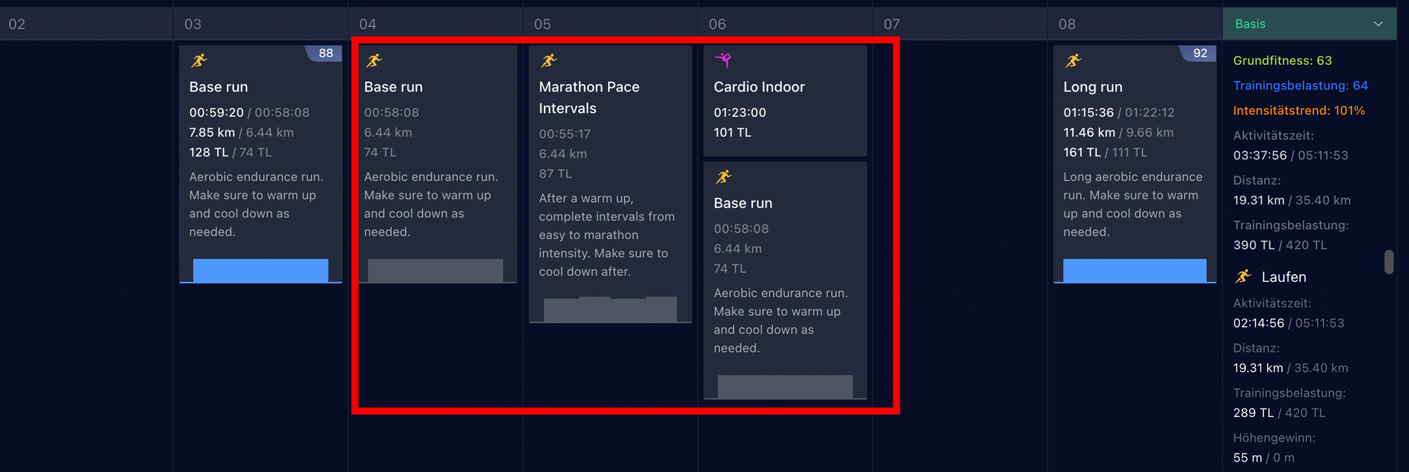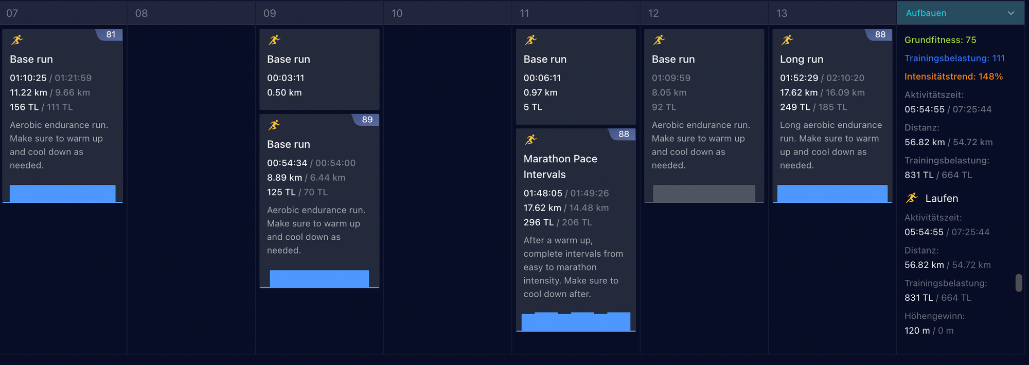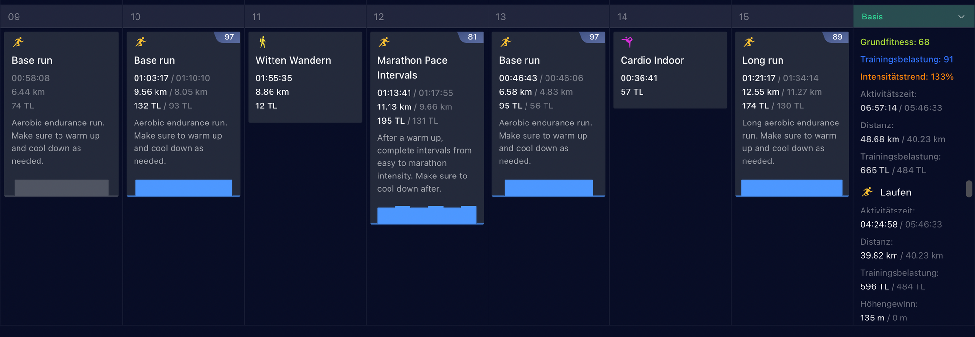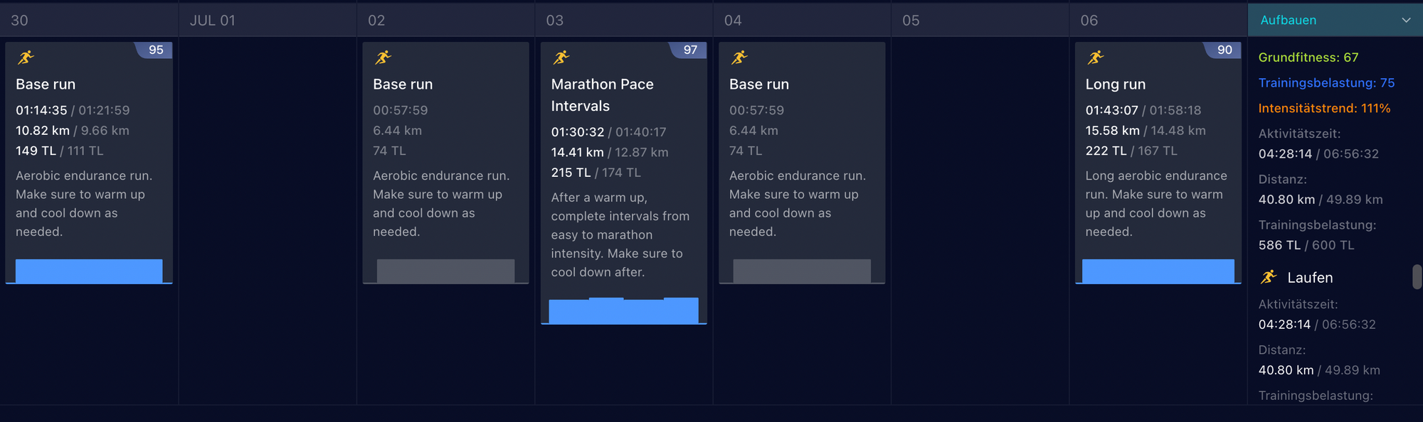 This week went better. My Achilles tendon was still giving me trouble, so I skipped two of my planned runs. But I managed to complete the key sessions – my marathon pace intervals and my long run. I also logged 40 km overall, which feels decent given the circumstances.