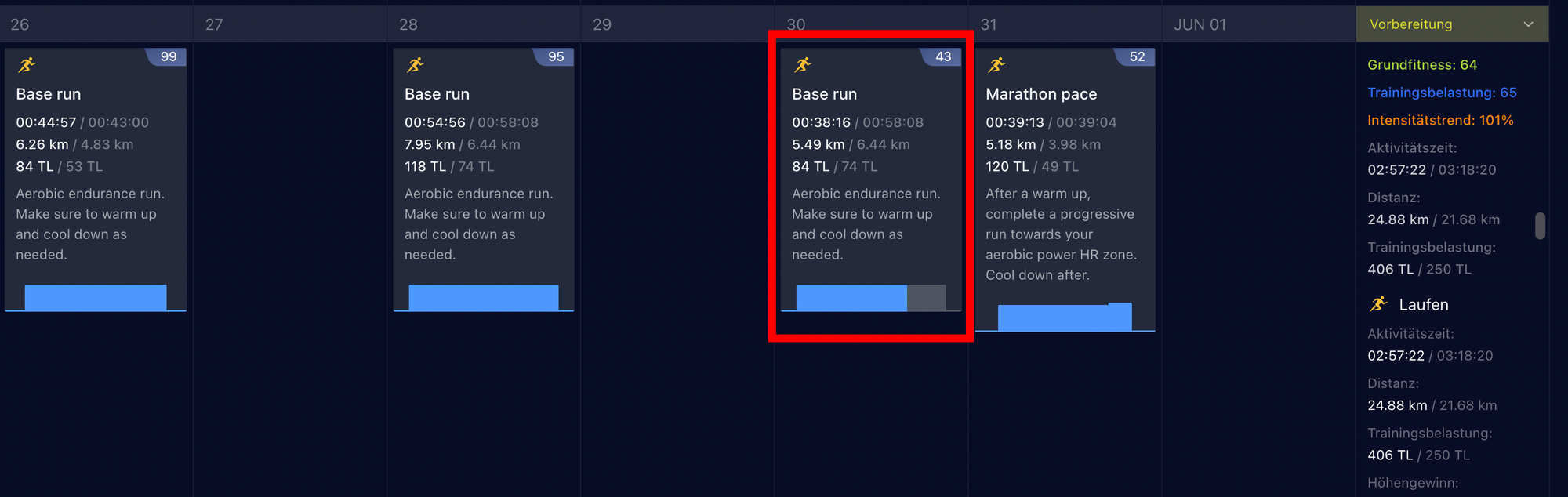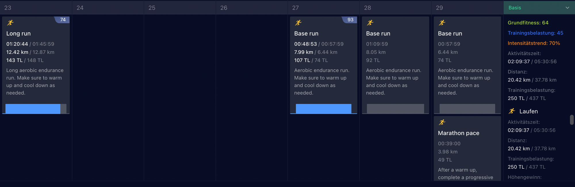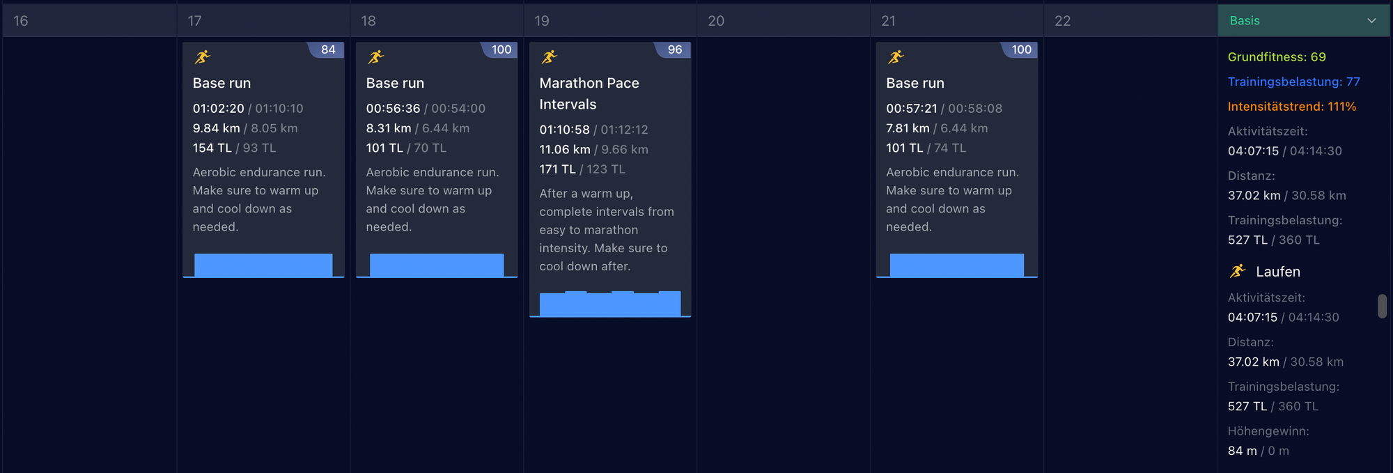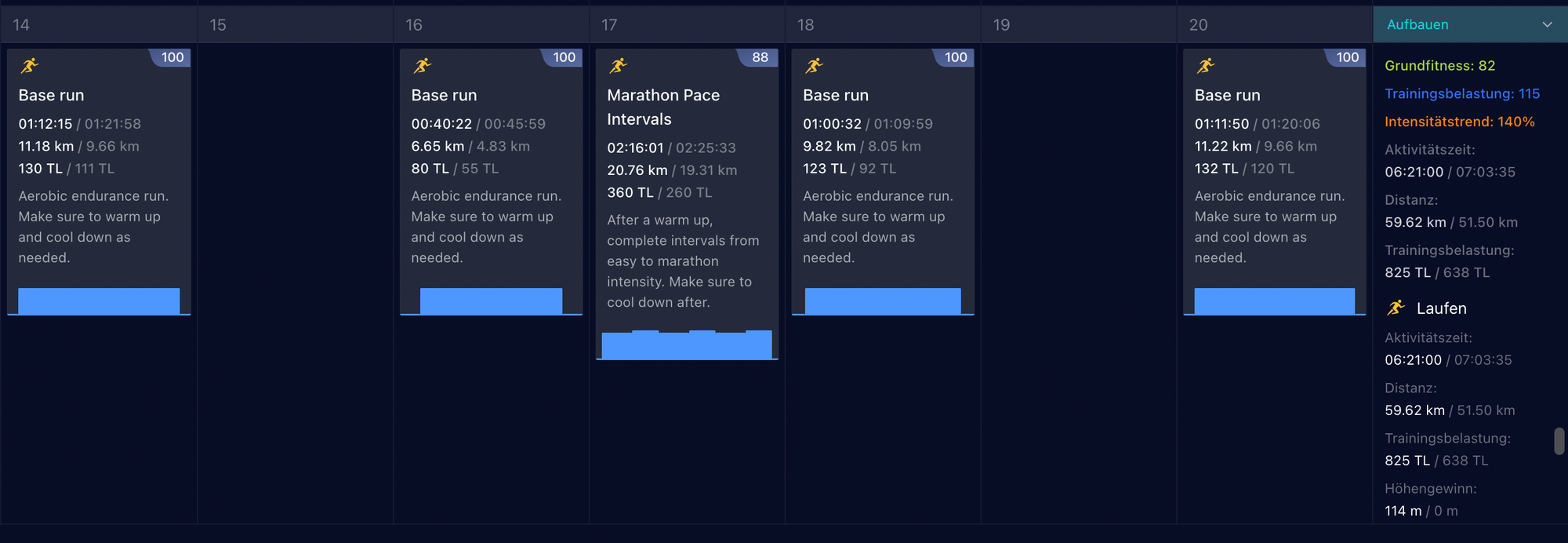 This week went better. My Achilles tendon was still giving me trouble, so I skipped two of my planned runs. But I managed to complete the key sessions – my marathon pace intervals and my long run. I also logged 40 km overall, which feels decent given the circumstances.